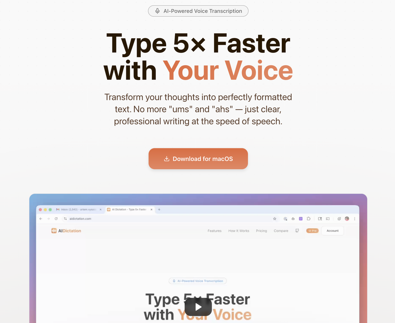 Transform your thoughts into perfectly formatted text. No more "ums" and "ahs" — just clear, professional writing at the speed of speech.